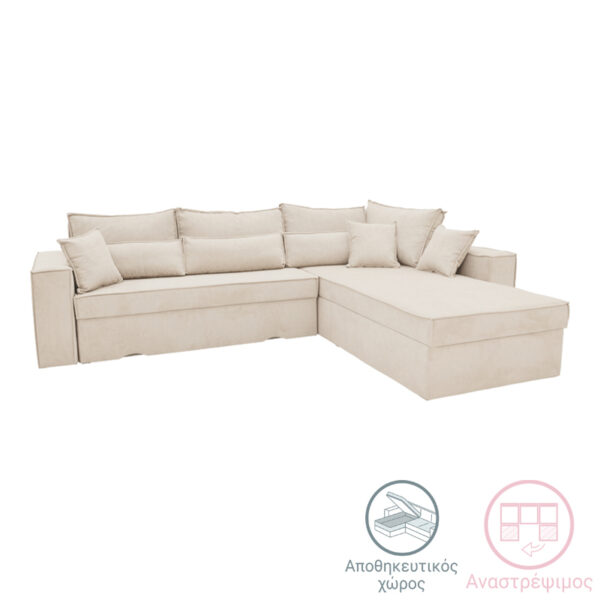 Γωνιακός καναπές-κρεβάτι αναστρέψιμος Venzie pakoworld ύφασμα σε μπεζ απόχρωση 283x214x83εκ