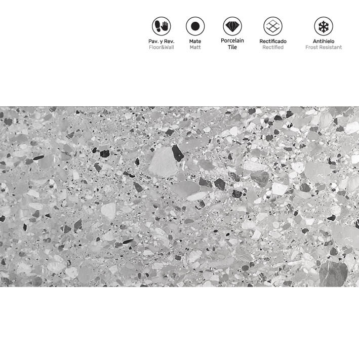 Γρανιτοπλακάκι 60×120 cm σε γκρι απόχρωση με ματ επιφάνεια που παραπέμπει σε μωσαϊκό. Κατάλληλo για χρήση σε χώρους εσωτερικούς αλλά και για εξωτερικούς.