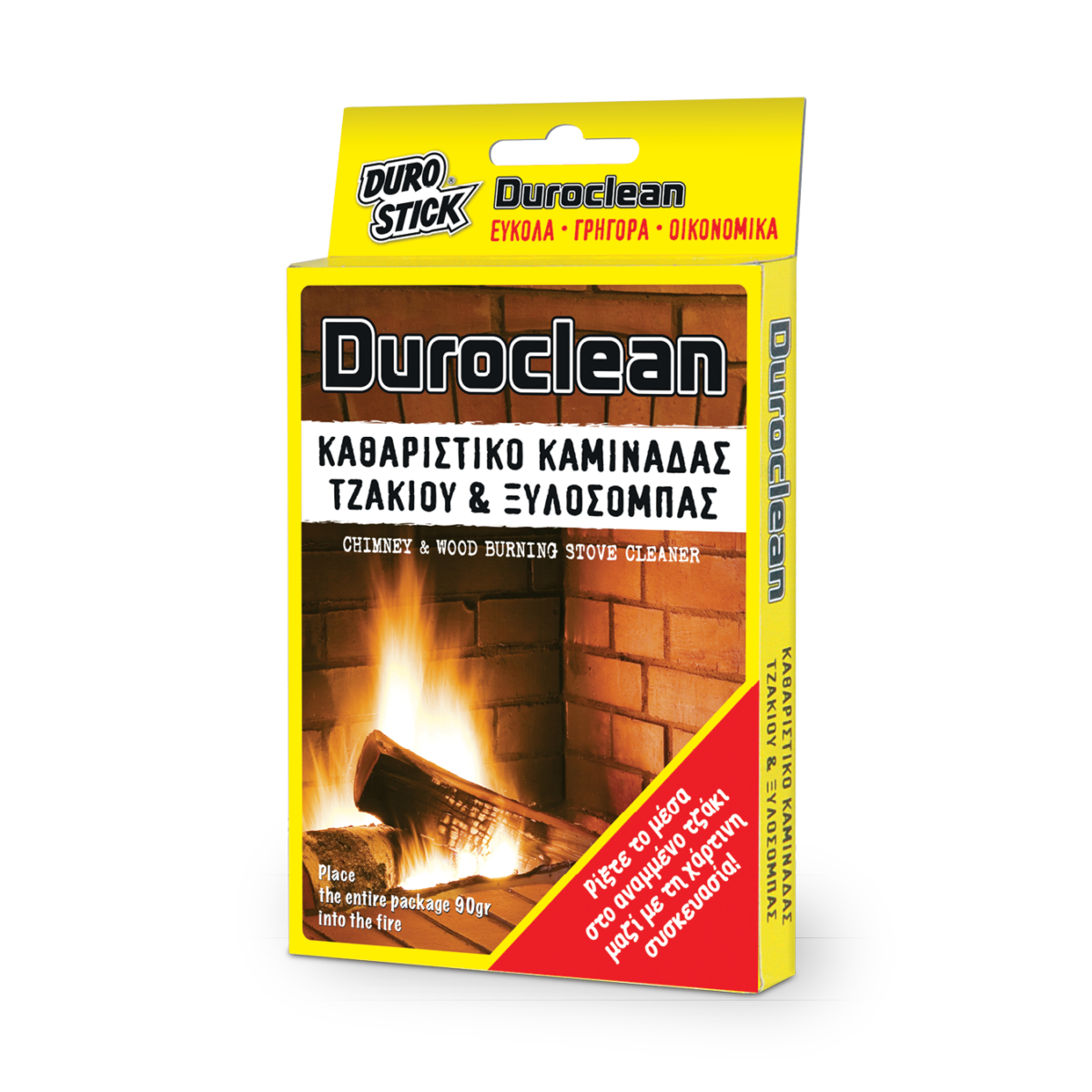 Ειδικό καθαριστικό σε μορφή σκόνης, για τον καθαρισμό υπολειμμάτων καπνιάς που συσσωρεύονται στα τοιχώματα καμινάδων και μπουριών. Η μέγιστη θερμική απόδοση και η καλή λειτουργία του τζακιού και της ξυλόσομπας επιτυγχάνεται με τον επιμελή καθαρισμό της καμινάδας. Αυτό διασφαλίζεται με τη χρήση του DUROCLEAN, χωρίς τη δική μας επίπονη προσπάθεια ή τη βοήθεια ειδικού τεχνίτη, σε ελάχιστο χρόνο, εύκολα και οικονομικά.