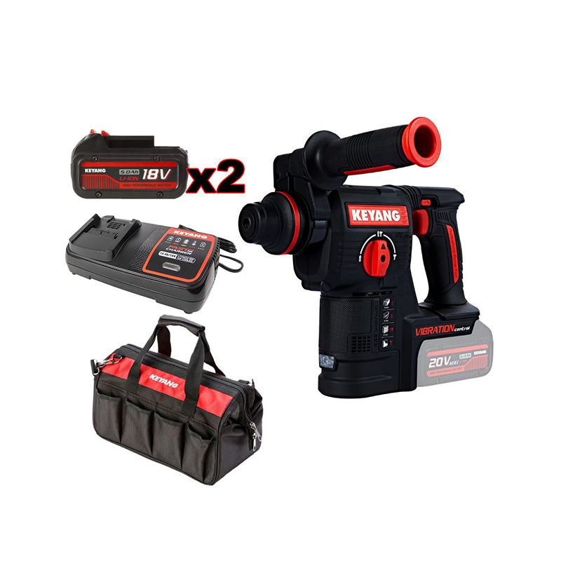 Σκαπτικό της εταιρείας Keyang, με μπαταρία λιθίου 18V χωρητικότητας 5Ah. Διαθέτει λειτουργία περιστροφής χωρίς κρούση για διάτρηση σε χαμηλής σκληρότητας υλικά. Επίσης, διαθέτει υποδοχή SDS – SDS Plus (TE-C) για καλύτερη απόδοση σε λειτουργίες περιστροφής με κρούση συγκριτικά με τις υπόλοιπες (ενδείκνυνται για εργασία σε μπετό ή πέτρα) και εύκολη αλλαγή τρυπανιών που μπορεί να γίνει ακόμη και με το ένα χέρι. Ακόμη, έχει δυνατότητα προσαρμογής της ταχύτητας έως 1000rpm ώστε να ρυθμίζεται ανάλογα με την εργασία που θέλετε να κάνετε και προστασία εμπλοκής για αποφυγή τραυματισμών σε περίπτωση που το εργαλείο κολλήσει κατά τη χρήση του σε κάποιο σκληρό υλικό. Τέλος, διαθέτει νέας τεχνολογίας κινητήρα χωρίς ψύκτρες, που προσφέρει μεγαλύτερη αυτονομία, διάρκεια ζωής και μειώνονται οι ανάγκες συντήρησης αλλά και οι προμήθειες ανταλλακτικών.